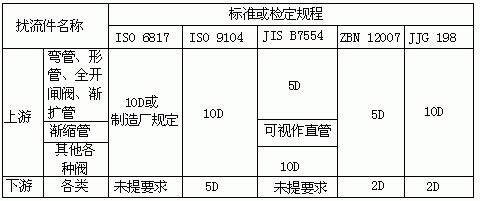 為獲得正常測(cè)量精確度,電磁流量傳感器上游也要有一定長(zhǎng)度直管段,但其長(zhǎng)度與大部分其它流量?jī)x表相比要求較低。90°彎管、T形管、同心異徑管、全開(kāi)閘閥后通常認(rèn)為只要離電極中心線(xiàn)(不是傳感器進(jìn)口端連接面)5倍直徑(5D)長(zhǎng)度的直管段,不同開(kāi)度的閥則需10D;下游直管段為(2~3)D或無(wú)要求;但要防止蝶閥閥片伸入到傳感器測(cè)量管內(nèi)。各標(biāo)準(zhǔn)或檢定規(guī)程所提出上下游直管段長(zhǎng)度亦不一致,匯集如表1所示,要求比通常要求高,這是由于為保證達(dá)到當(dāng)前0.5級(jí)精度儀表的要求。表1