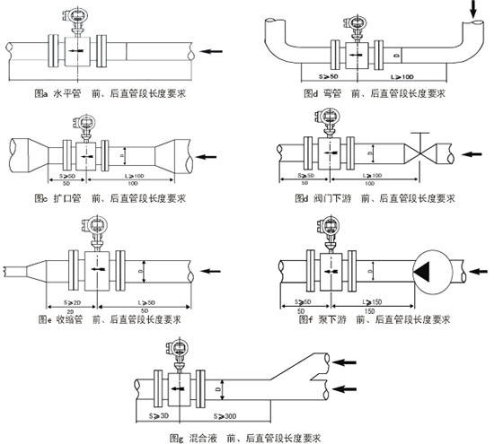 傳感器安裝管道上游側直管段長度應大于或等于10D,下游側應不小于5D(D為被測管道通徑)。