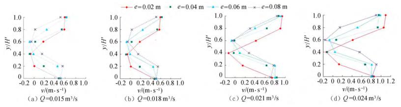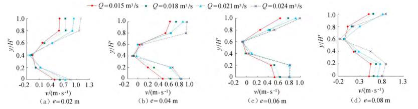 由圖5可知,當e相同時,斷面*小流速發生的位置相同,發生在浮體結構下游回流區位置。隨著來流流量的增大,流經浮體結構下泄的水流流速在上層和下層水體中呈現增大的趨勢。浮體結構位置不變,由于受到浮體結構的擠壓,上游來流分別經過浮體結構上部、下部進行泄流,因此在下游區域的上層、下層水體中,流速較大;受浮體結構的阻擋,浮體結構下游區域形成回流區,流速較小。試驗過程中,由于控制浮體結構所在水域的上游、下游水位不發生變化,因此隨著來流流量的增大,流速呈現增大的趨勢。