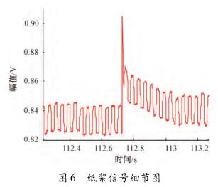 為了進一步研究水煤漿信號的特點,將其與紙漿信號進行對比。通過分析課題組采集的25Hz矩形波勵磁下的紙漿信號發現,在同樣流速下,測量介質為紙漿時,傳感器輸出信號經調理放大后能明顯看到與流量相關的感應電動勢信號,且其漿液干擾僅為數十毫伏,要遠小于水煤漿信號中的漿液干擾,如圖5所示。對圖5所示的紙漿信號進行局部放大,得到如圖6所示的信號??梢?,紙漿信號中的漿液干擾持續的時間也遠小于水煤漿信號中的漿液干擾,且頻率較低。