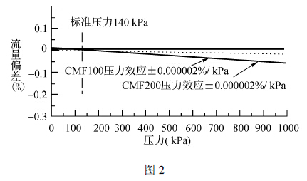 從圖2 中, 我們可以看出壓力對測量準確度的影響:當(dāng)工藝壓力增大, 會使流量計產(chǎn)生一個負向偏差, 表現(xiàn)為流量顯示值比實際值偏小;當(dāng)壓力減小時, 會使流量計產(chǎn)生一個正向偏差, 表現(xiàn)為流量顯示值比實際值偏大。