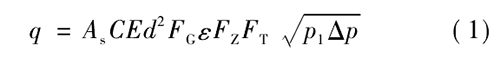 式中,、為標準狀態下天然氣體積流量,m; /s;  A,為秒計量系數,視采用計量單位而定,此處A=311 794 x 10 -6;  C為流出系數;E為漸近速度系數;d為孔板直徑,mm;  F}為相對密度系數;。為可膨脹系數;F:為超壓縮因子;F:為流動溫度系數;P,為孔板上游側取壓孔氣流絕對靜壓,Pa;0P為氣流流經孔板時產生的壓差,Pao