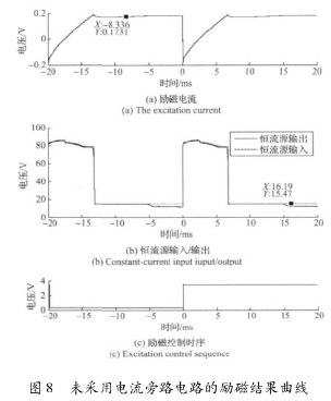 實驗結果表明,高壓源向低壓源切換后,三端穩壓器的工作特性致使的電流波動和低壓源供電情況下的恒流控制,會大幅延長勵磁電流的穩態響應時間。圖8所示勵磁電流約在17ms左右進入穩態,圖9所示勵磁電流的穩態響應時間約為12ms。這表明,在采用三端穩壓器搭建恒流控制電路的情況下,電流旁路電路能有效克服三端穩壓器工作特性的影響,并能方便的實現電流超調,加快勵磁電流的響應速度。