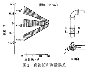 流體流過彎管后,下游產(chǎn)生流速分布畸變,若是兩只鄰近相接的不同平面彎管,除流速分布畸變外還會有漩渦。這些現(xiàn)象要影響裝在下游的大部分類型流量儀表(除容積式等少數(shù)類型外)的測量值,因此通常要求在流量儀表安裝點之前有一定長度直管段,改善進入儀表的流動狀況。廢水流量計受彎管影響較小,直管長度要求也遠低于節(jié)流差壓式、渦街式等其他流量儀表。但是當前廢水流量計精度為測量值的0.5%,甚至0.2%~0.4%,即使影響量較小,還是受到人們的關(guān)注。