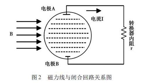 2. 1 正交干擾衛生型卡箍電磁流量計的磁路系統包含有兩個勵磁線圈,而導管內的液體與傳感器電極及轉換器結構組成了一個閉合的回路,如圖2 所示。理論情況下,磁力線( 圖中B) 應與閉合回路相平行,但是由于裝配過程中的誤差,導致磁力線不可能完全平行于這一閉合回路,出現部分磁力線成一定角度穿過回路的現象,這引起了即使沒有液體流動的情況下,傳感器的電極上也會產生感應電動勢,就形成了正交干擾的基本形式。