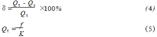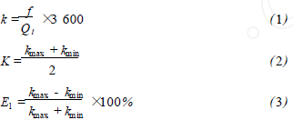 乙烯流量計在標準水裝置上,分別用頻譜分析和脈沖計數的方法進行標定,流體介質為水未加氣體,采用的標準傳感器為精度等級為0.2級的電磁流量計。在每個流量測量點上的儀表系數用公式(1)計算,然后用式(2)計算得到*終儀表系數K。Ql為被測水的流量值,f為每一個流量點得到的頻率,k為每個測量點得到的儀表系數。kmax、kmin分別為試驗流量范圍內得到的*大與*小的儀表系數。儀表系數的線性度E1用式(3)來計算。