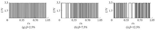 試驗發現,氣相的加入對乙烯流量計測量的影響顯著,譜分析和脈沖計數兩種方法隨著氣相注入的增加其表現也不同。圖4反映了水流量12m3/h時,注入不同氣含率β時A點的模擬信號,如圖4(a~c)所示;經譜分析后得到的頻率值,如圖4(d~f)所示;用脈沖計數方法得到的脈沖信號,如圖4(g~i)所示。圖4顯示,當注入氣量不大時,對乙烯流量計的影響不大,無論是譜分析結果還是脈沖計數得到的結果都比較好。當注入的氣量進一步增加時,渦街原始信號強度和穩定性逐漸變差,渦街頻率信號會被干擾信號所淹沒,反映到譜分析圖是,渦街頻率的譜能量減小,干擾信號的譜能量加強;對于脈沖信號,會因為一些旋渦信號減弱,形成脈沖缺失現象,而不能真實地反映渦街產生的頻率。