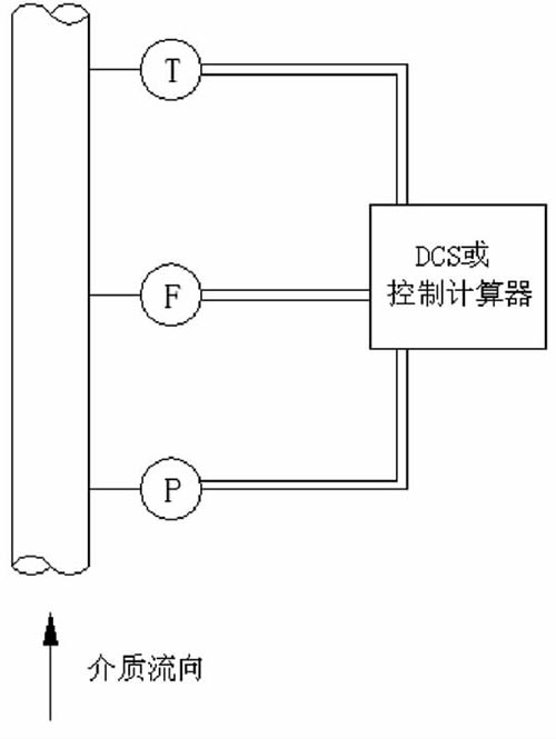 流量計(jì)、溫度變送器、壓力變送器單獨(dú)安裝,流量信號(hào)、溫度信號(hào)、壓力信號(hào)分別輸入DCS或控制計(jì)算器進(jìn)行流量的溫度、壓力補(bǔ)償計(jì)算,完成流量、壓力、溫度各參數(shù)的顯示、輸出、打印等功能。此種結(jié)構(gòu)安裝靈活,特別適用于現(xiàn)場流量計(jì)的升級(jí)改造,如圖2所示。號(hào)、溫度信號(hào)、壓力信號(hào)輸入到溫壓補(bǔ)償功能設(shè)計(jì)的流量計(jì)轉(zhuǎn)換器中,進(jìn)行流量的溫度、壓力補(bǔ)償計(jì)算,完成流量、壓力、溫度各參數(shù)的顯示、輸出、打印等功能。此種結(jié)構(gòu)測量準(zhǔn)確度高,體積小,安裝方便,如圖3所示: