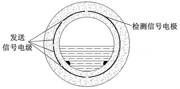 ③利用阻抗或信號衰減研制的非滿管管道式電磁流量計。這種結構的非滿管管道式電磁流量計是當前國內研究的方向之一。其結構是流量管底部貼一對信號發射電極,在流量管中間貼信號接收電極。由于信號在流體中傳播會產生衰減,且傳播時間越長,衰減越多,因此通過信號接收電極接收到的信號衰減量即可得知液面高度;同時該電極還能測量流體切割磁感線產生的電動勢,以此達到測量非滿管流量的目的。阻抗式或信號衰減非滿管管道式電磁流量計結構簡圖如圖5所示。