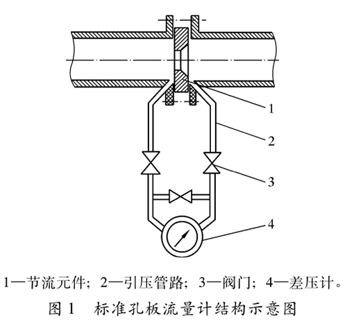 標準管道空氣流量計結(jié)構(gòu)如圖1所示,包括節(jié)流元件(標準孔板及其取壓裝置)、傳輸壓差信號的引壓管路、閥門以及差壓計等部分。標準孔板是壓差測量時的一次元件,人們利用它在管道內(nèi)使流體產(chǎn)生壓差,再通過引壓管路把孔板前、后產(chǎn)生的壓差傳送給差壓變送器,再輸人到二次儀表,從而顯示出管道內(nèi)流體的靜壓、壓差、瞬時流量和累計流量等計量參數(shù)。