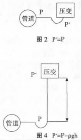 建議采用圖2的安裝方式,如不得已需要選擇圖3、圖4的安裝方式一定要對壓力進(jìn)行補(bǔ)償。不建議按照圖5的方式安裝,因為無法確定P'與P的關(guān)系。