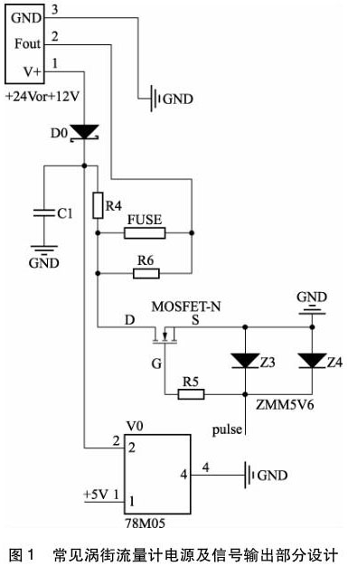 絕大多數的電磁干擾,都是通過電源線、信號線進入到電子電路內,同樣,氮氣流量計也是如此。圖 1 為常見氮氣流量計電源及信號輸出部分設計。