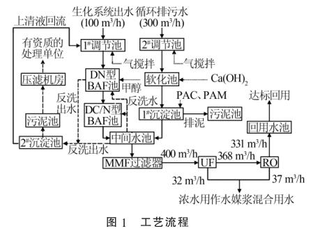 2種廢水在中間水池混勻后,通過泵提升進(jìn)入保安過濾器,進(jìn)一步去除細(xì)小的懸浮物后經(jīng)過增壓泵進(jìn)入超濾膜(UF)處理系統(tǒng)和反滲透(RO)系統(tǒng),然后通過管道式電磁流量計(jì)進(jìn)行計(jì)量。反滲透出水直接進(jìn)入回用水池達(dá)標(biāo)回用,超濾濃水以及反滲透濃水用作水煤漿混合用水。污泥池中的污泥通過泵打入帶式機(jī)壓濾處理,濾液自流進(jìn)入1#調(diào)節(jié)池。工藝流程見圖1。