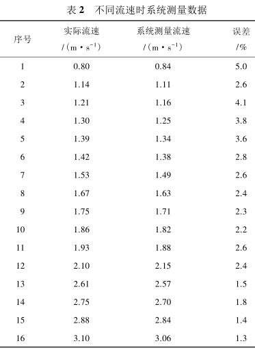由表 2 測(cè)量數(shù)據(jù)可知,系統(tǒng)在測(cè)量低流速液體時(shí)(流速小于 1 m/s)誤差較大,達(dá)到 5%,當(dāng)待測(cè)液體的流速增大時(shí)(大于 1.4 m/s),誤差逐漸減小,基本維持在 3%以內(nèi)。由此可見系統(tǒng)具有較高的檢測(cè)精度,尤其是當(dāng)管道中的液體流速較高時(shí),系統(tǒng)的檢測(cè)誤差不超過(guò) 3%,達(dá)到了設(shè)計(jì)預(yù)期。