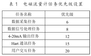 下面以電磁流量計為例說明基于 μC/OS-III 的人機界面設計。 先將 μC/OS-III 移植到 Cortex-M3 處理器上,這里選用的是 STM32F103VET6 。電磁流量計的應用程序若按照上節的任務種類劃分有: 數據采集任務、數據處理任務, 4~20mA輸出任務, Hart 通訊任務以及用戶交互任務。 先對不同的任務進行優先級的劃分,如表 1 所示。