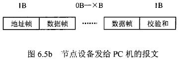 插入式電磁流量計(jì)等節(jié)點(diǎn)設(shè)備和C機(jī)通信的過程中,由地址幀、命令幀、數(shù)據(jù)幀、校驗(yàn)和可組成各種功能不同的報(bào)文。由于采用主從工作方式來實(shí)現(xiàn)通信,插入式電磁流量計(jì)等節(jié)點(diǎn)設(shè)備僅能接收并執(zhí)行PC機(jī)發(fā)送來的控制命令,而不能發(fā)送命令給PC機(jī)。因此,由PC機(jī)發(fā)往流量計(jì)等節(jié)點(diǎn)設(shè)備的報(bào)文一般包括一個(gè)地址幀,一個(gè)命令幀,若干個(gè)數(shù)據(jù)幀和一個(gè)校驗(yàn)和,其報(bào)文格式圖.6a5所示;而由流量計(jì)等節(jié)點(diǎn)設(shè)備發(fā)往PC機(jī)的報(bào)文一般包括一個(gè)地址幀,若干個(gè)數(shù)據(jù)幀和一個(gè)校驗(yàn)和,其報(bào)文格式如圖6.5b所示。