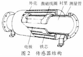 液體流量計(jì)由流量傳感器和轉(zhuǎn)換器兩部分組成。傳感器典型結(jié)構(gòu)示意如圖2,測(cè)量管上下裝有激磁線圈,通激磁電流后產(chǎn)生磁場(chǎng)穿過測(cè)量管,一對(duì)電極裝在測(cè)量管內(nèi)壁與液體相接觸,引出感應(yīng)電勢(shì),送到轉(zhuǎn)換器。激磁電流則由轉(zhuǎn)換器提供。
