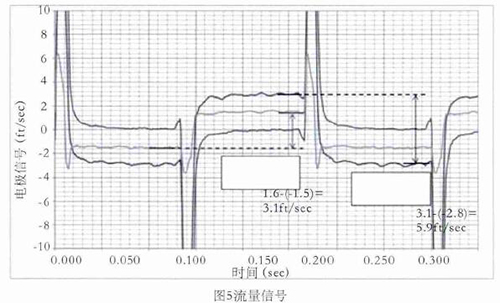 舉例,如圖5所示,線圈采用5Hz驅動時的0feet/s,3.1feet/s,5.9feet/s流速下的電極信號,利用上述方法對信號進行處理并計算流速。取每半波*后的20%納入流速計算,正半波與負半波相減即是流速。如3.1feet/s–(-2.8feet/s)=5.9feet/s,雖然有+0.15 feet/s的直流偏置,但也不影響流速的計算。因線圈是5Hz驅動,半波的20%是20ms,正好是1個完整的工頻周期,這樣就不受工頻干擾的影響。正半波與負半波相減,這樣就避免了直流偏置和共模干擾的影響。再加上在數字濾波過程中使用限幅濾波和算數平均,保證了流量信號的有效提取。