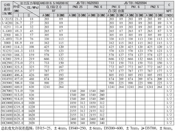 壓力等級(CL/MPa):150/2.0、300/5.0、600/11.0、900/15.0、1500/26.0、2500/42.0
