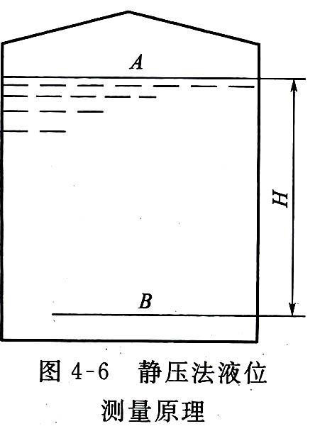 由式(4—8)和式(4—9)可知,液體任何一點的壓力等于其表面壓力加上液體密度與重力加速度及液柱高度的乘積。液體的靜壓力是液位高度和液體密度的函數(shù),當液體的密度為常數(shù)時,A、B圖4—6靜壓法液位測量原理兩點的壓力或壓差僅與液位高度有關(guān)。因此可以通過測量P或Ap來實現(xiàn)液位高度的測量。這樣液位高度的測量就變?yōu)橐后w的靜壓測量,凡是能夠測量壓力或壓差的儀表,只要量程合適均可用于液位測量。
