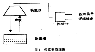 常見的液位傳感器有磁浮筒式、壓力式等,磁浮筒式傳感器要安裝在被測(cè)介質(zhì)中,長(zhǎng)時(shí)間使用易被腐蝕,而壓力傳感器輸出線性較差且成本較高。超聲波傳感器的特點(diǎn)是使用時(shí)與液面脫離接觸,無腐蝕問題,且價(jià)格低廉。超聲波傳感器由控制卡及換能器構(gòu)成,如圖I。