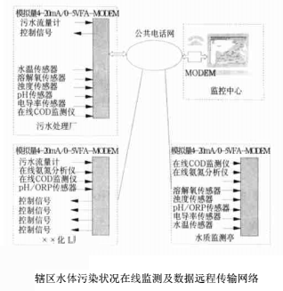 本文介紹的水體污染狀況在線監測及數據遠程傳輸網絡可以連續、自動監測排污口的污水流量和水質參數,既可以分別顯示污水流量的瞬時值/日平均值/月平均值、pH/溶解氧/電導率/濁度/水溫/COD/TOC/NH4-N/**3-N等常規參數,也可以實時計算污染物排放總量并經公共通信網絡(電話線路)傳輸至區(縣)、市級的監控中心,在轄區的電子地圖(GIS)上動態顯示各排污口的*新數據,是環保、市政、水利等監理部門實時觀測轄區水質變化情況的現代化管理工具。系統組成如下: